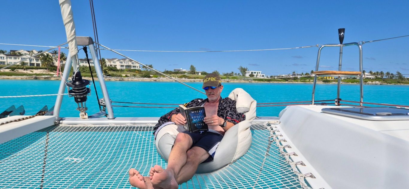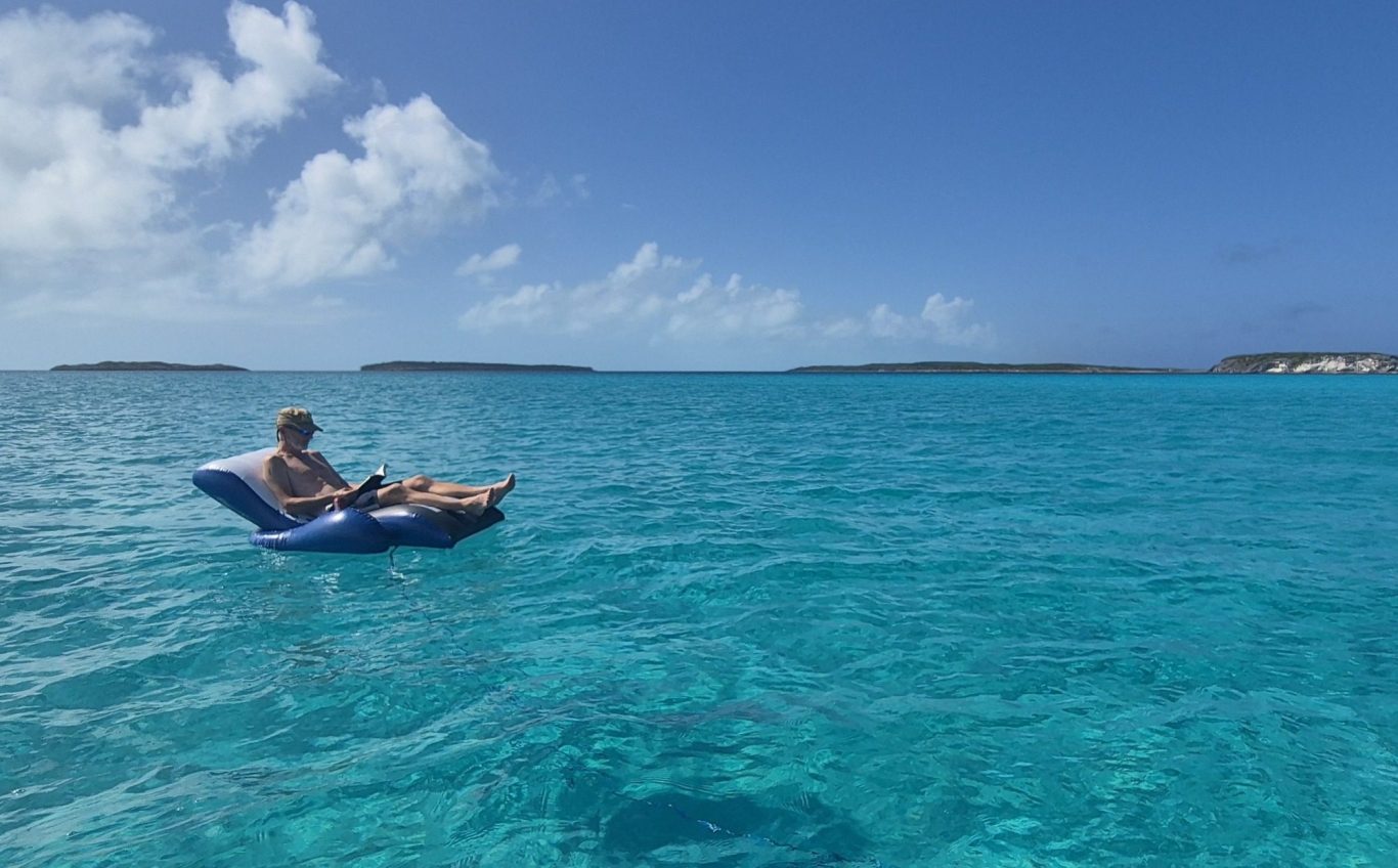 We were the only boat anchored at Cave Cay, which was lovely and peaceful after busy Georgetown; Pete even got the floating chair out and read his book. The following day we were waiting for low tide to visit Ribbon Sandbar, and whilst it didn’t completely dry out we were still stood miles away from land in ankle deep beautiful clear water – a stunning experience and even better as we were the only two people there.