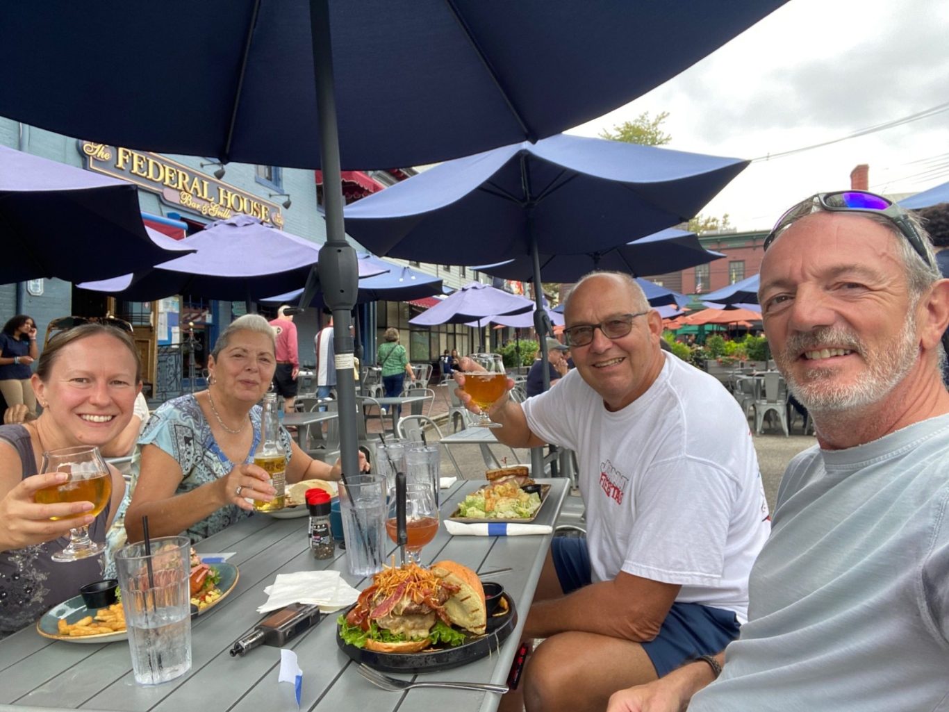 Relaxing back at the boat and pondering which pizza to order as a treat for our endeavours, our visitors arrived – 24 hours early! However, it was lovely to see them, and we spent the next few days sightseeing in Annapolis, taking the boat for a tour of the harbour, which included going under some bridges for which we have a tight clearance(!), relaxing on the boat and going out for some nice food. Annapolis is also the home of the US Naval Academy, our equivalent of BRNC Dartmouth. As foreigners we are not allowed entry to the site, so we had to make do with a drive-by from the water instead.