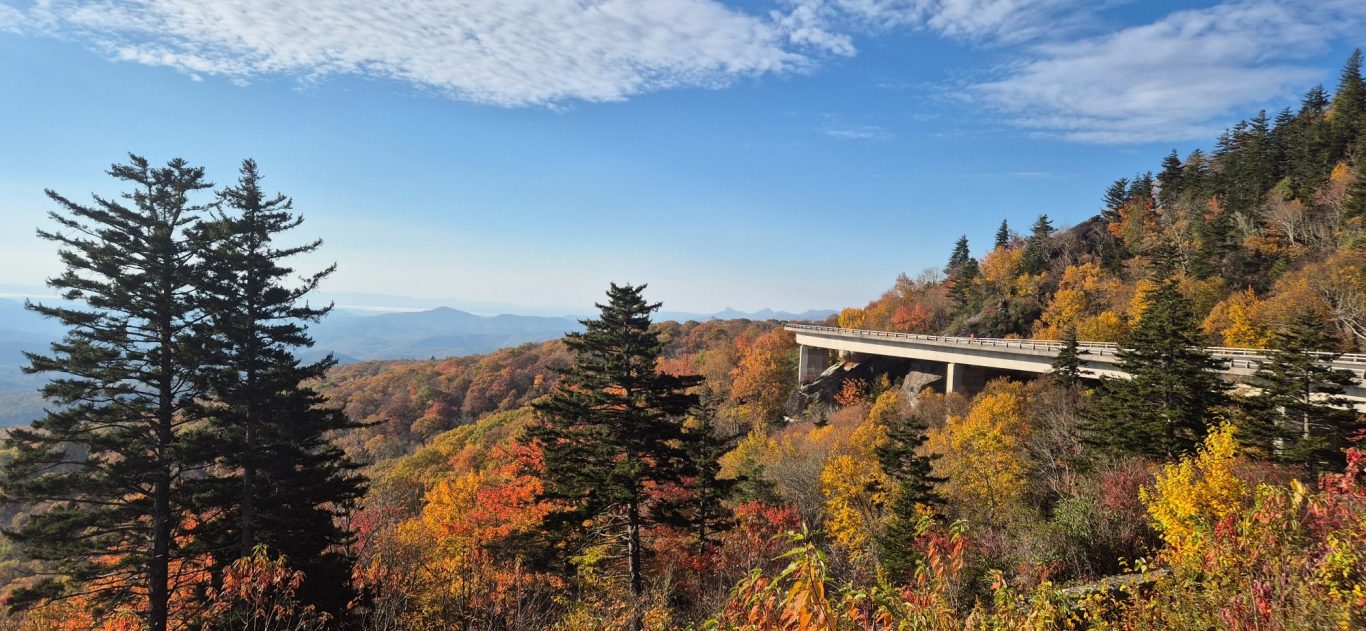 Our final day on the drive was another beautiful day, and we stopped at another iconic viewpoint, this time the Linn Cove viaduct, a famous bridge built on the edge of Grandfather Mountain. We then had to do a significant detour near to Linville Falls as the Parkway was still severely damaged following Hurricane Helene in 2024, before finishing our road trip adventure at Cherokee with enough time to visit Oconaluftee Indian Village, a living history museum showing life within a Cherokee village in the 18th century.
