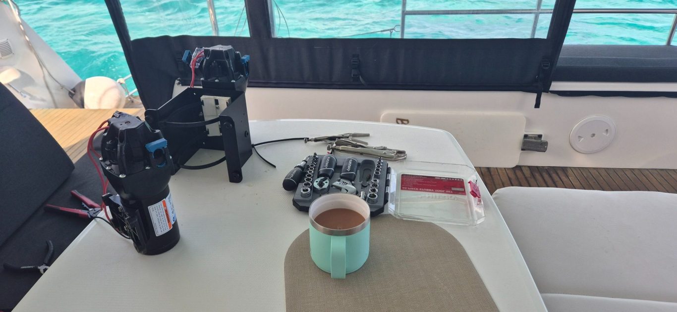 As always, there is something that breaks on the boat and this time it was our freshwater pump. We have two big water tanks in the front locker of the boat and a pressurised pump which moves that water to the various taps and showers – however for some reason the pressure regulator seemed to stop working and therefore there was no water pressure and no flowing water. Normally, hitting it with a hammer (no, really!) works and whilst this did the job for that evening, it wasn’t a permanent fix and a full replacement was necessary. Luckily, we have a big box of spares which included a new pump and Pete spent the majority of the morning swapping it over.