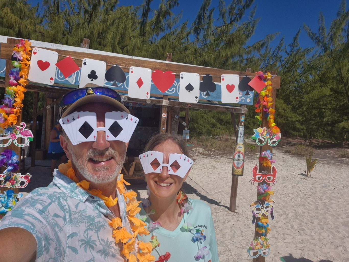 Whilst we weren’t going to race our boat, there were still lots of activities we could get involved in including the ‘Poker Run’ which was the opening event. This involved going to seven different bars, 4 in Georgetown, 3 on Stocking Island including the final stop, a pop-up bar on the beach. You could visit the bars in any order and at each bar you picked a card which became part of your hand. The Peace and Plenty hotel was a popular starting point as the furthest away from the end, a pretty hotel with a bar and pool overlooking the harbour – there was also a turtle hanging around the dingy dock wondering what was going on! We continued our quest to the other bars finishing the island with passable hands. We then moved onto Stocking Island, stopping at the Da Sand Bar where we sat drinking a beer on the sun loungers and then onto the Snappy Turtle for a snack. Kylie had now got a pretty poor hand, so she was just in it for the Poker card glasses and the sparkly pink flamingo glasses, (borrowed unfortunately!), whilst Pete was doing ok until the end.