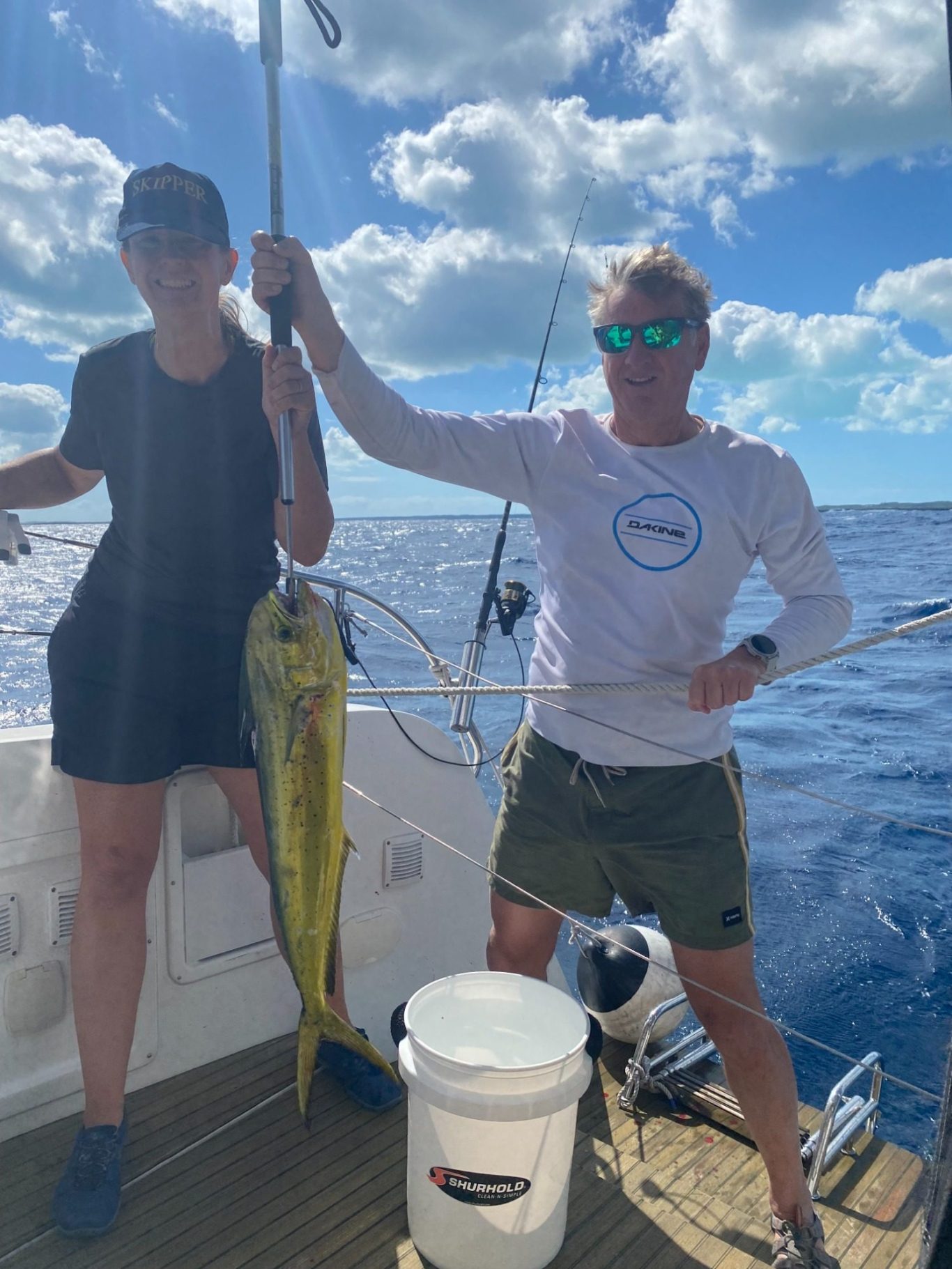 One of our stops on the way south was Staniel Cay where we explored Thunderball Grotto, a remarkable cave that featured in the James Bond film of the same name. It was a wet and wild journey to get there, so we stopped off on the way back to see the ‘pet’ nurse sharks at Staniel Yacht Club. Heading further south, we followed the line of the deep water drop off to the east of the Exhumas chain and were rewarded with our first ‘proper’ fish, a medium sized Mahi Mahi. These are fast swimming fish with incredible strength, so it was a team effort to get it aboard. Once we stopped for the night, an operating table was set up in the cockpit for our first filleting session which seemed to go pretty well and not much was wasted. Needless to say, Mahi fillets were on the menu that night!