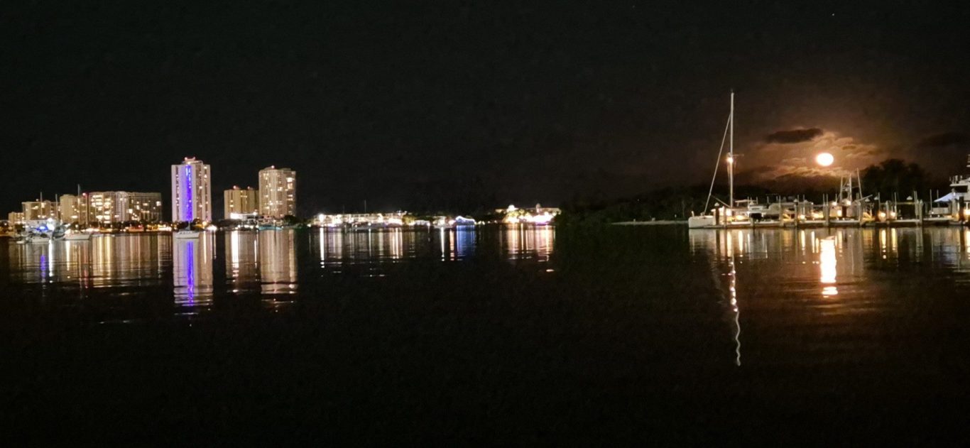 The next morning was an early start, however not as early as anticipated due to fog and bad visibility. We still managed to leave with the tide, heading for Fort Pierce, our next stop down the east coast. Coming into the channel, the tide and wind were not in our favour, and we had to take it carefully leading ‘Firefly’ in behind us. We anchored in one of the inlets and were joined for dinner by the son of one of Pete’s university friends who is currently undertaking his commercial pilot’s licence training nearby.